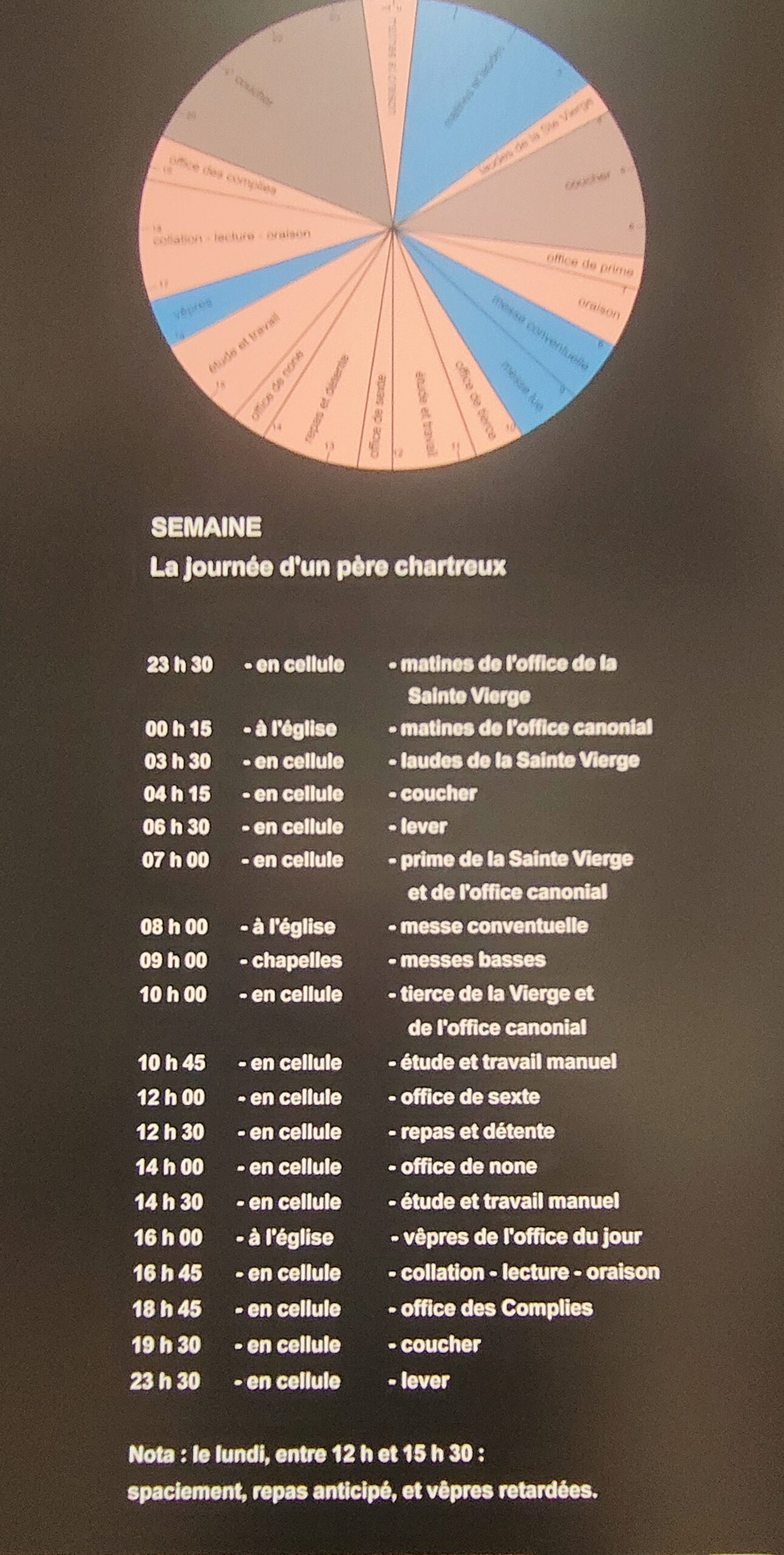 Les rares exceptions à cet isolement sont les dimanches et jours de fête (ils déjeunent ensemble à midi seulement et ont une récréation commune) ainsi qu’une promenade hebdomadaire durant laquelle ils cheminent deux par deux et parlent librement.